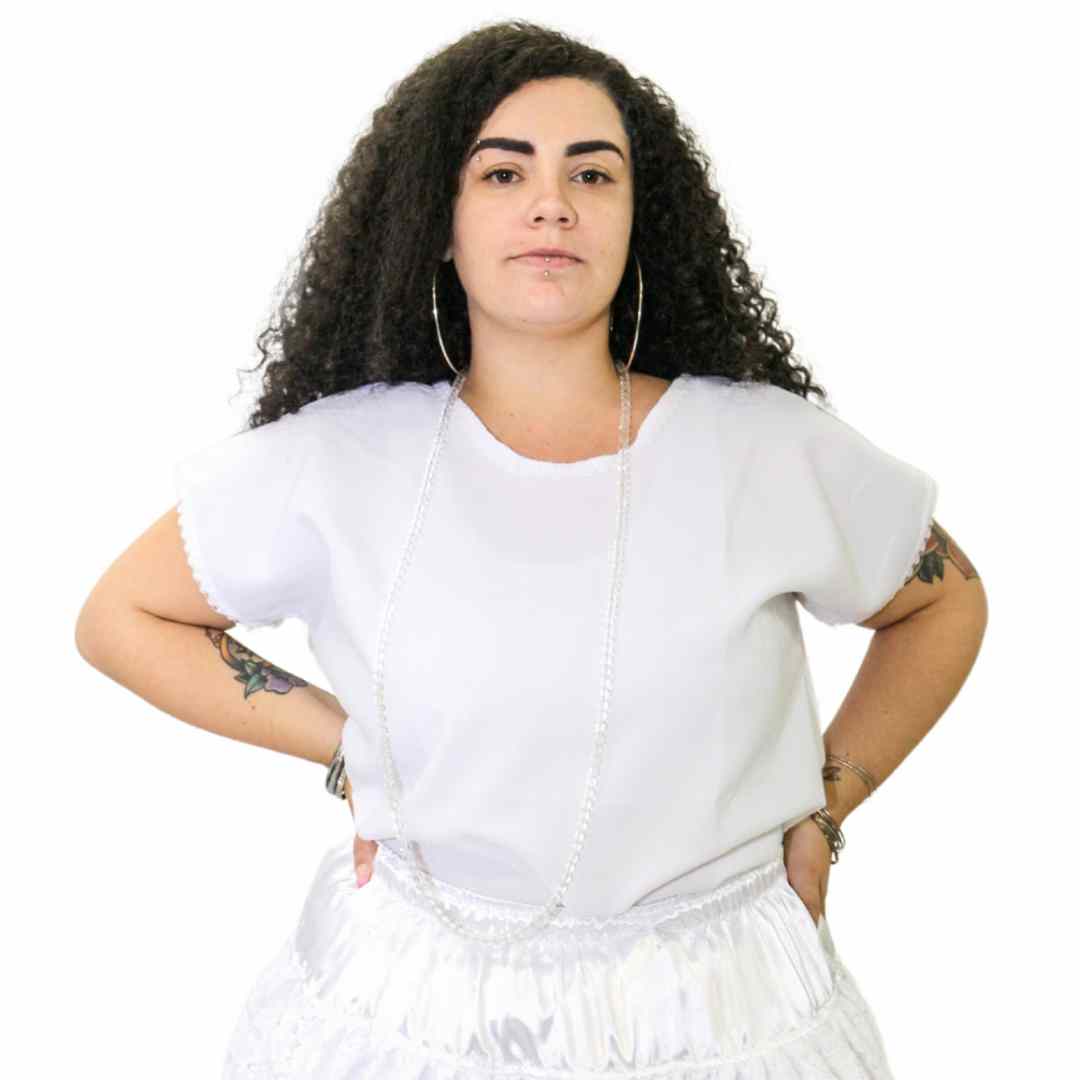 Camisú leve e confortável, feito em microfibra, ideal pra giras, obrigações e festas de santo. Disponível nas cores branco, preto e vermelho, cada uma vibrando com o axé dos Orixás. Possui renda delicada nas mangas e na gola, trazendo beleza e respeito à tradição.